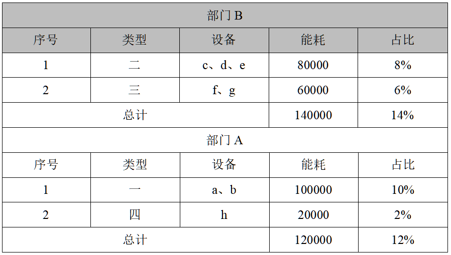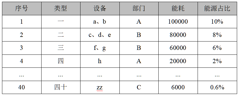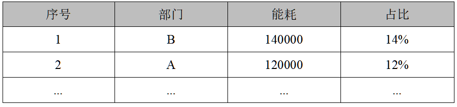 如表所示,在已经将相同类型合并的情况下依然有40个SEU,这时我们可以将上述40个类型中相同部门的归总,分析统一出部门的能耗和占比,再将其从高到低排序。
